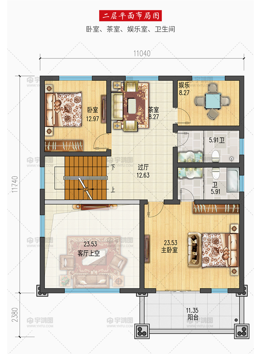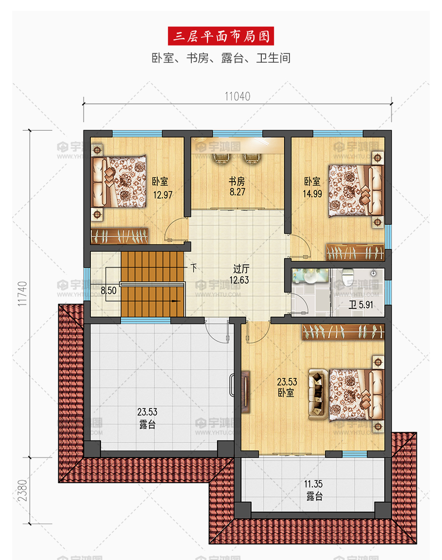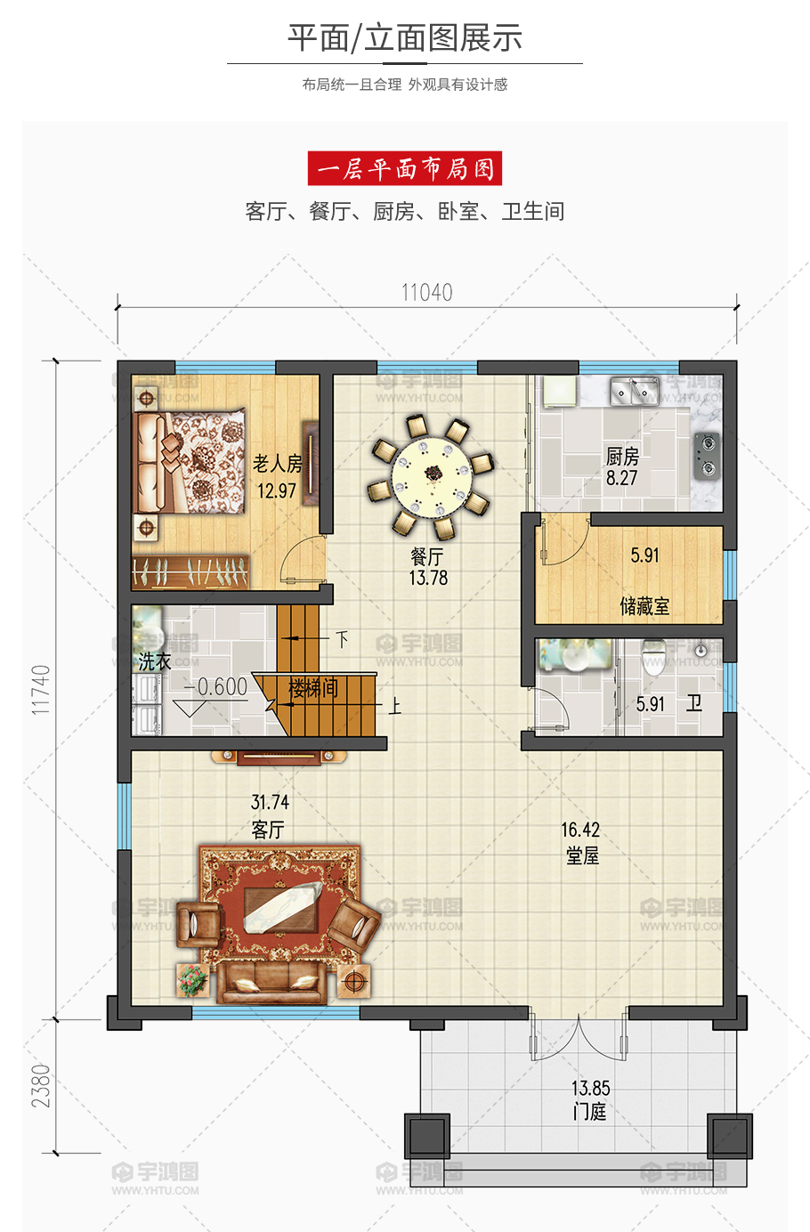 | 開間:11.04米 | 進深:14.12米 | 占地面積:129.6平方米 | 建筑面積:352.29平方米 |