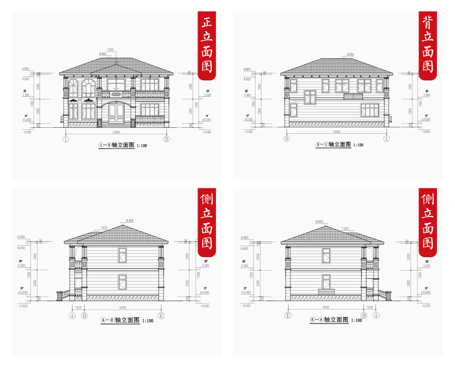 建筑立面圖:東立面圖,西立面圖,南立面圖,北立面圖,剖面圖;
