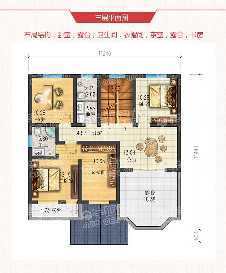 11x12米復式三層農村別墅設計圖紙,本戶型為復式三層經典農村自建別墅設計圖,參考造價25萬左右。經典耐看,不容易過時,也不會落伍。墻面用黃色和乳白色真石漆裝飾,紅色屋頂清新脫俗,寬闊的落地大玻璃格外顯眼,戶型布局合理。一層進門右手邊是客廳,左手邊設有一間主臥帶有內衛,可根據家庭需求設為老人房。廚房和餐廳融為一體非常方便。