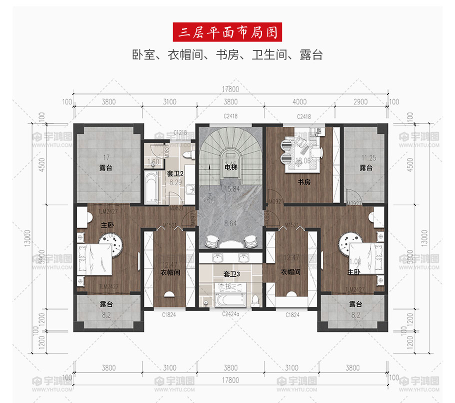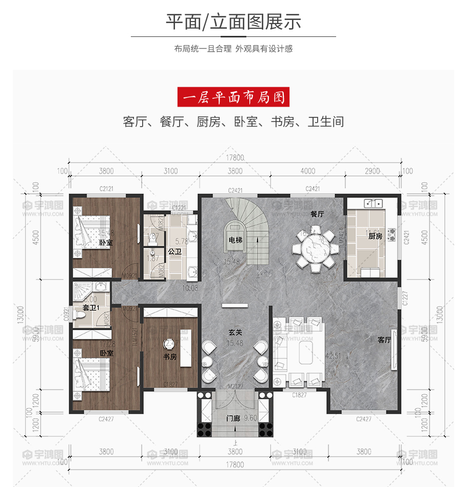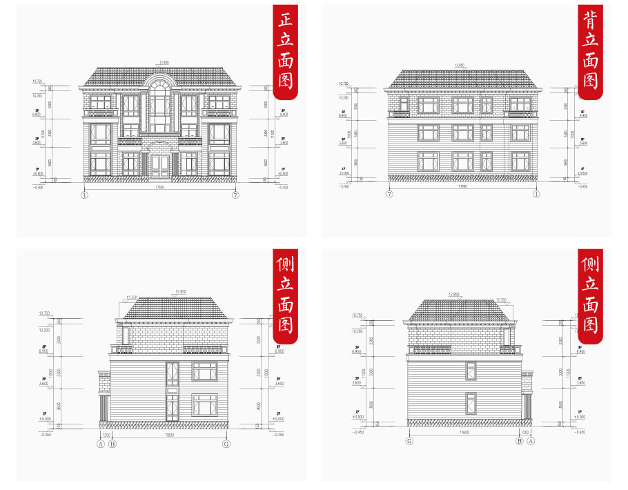 建筑立面圖:東立面圖,西立面圖,南立面圖,北立面圖,剖面圖;