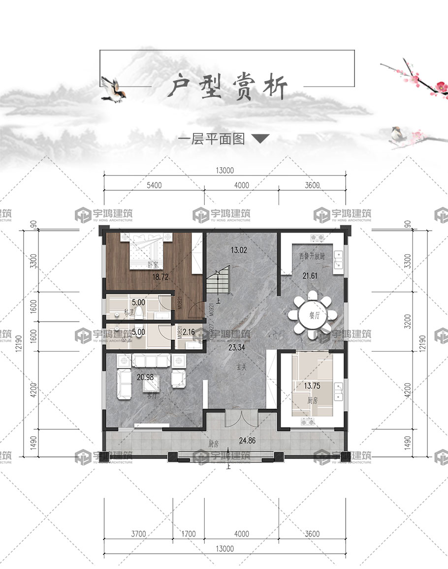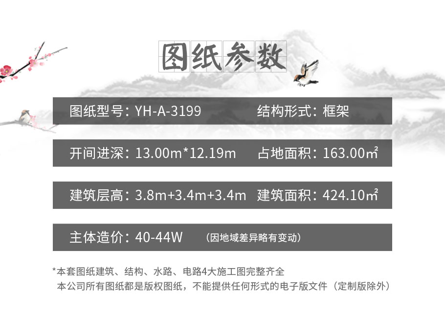 | 風格:新中式 | 層數:三層 | 結構形式:框架結構 | 圖紙編號:YH-A-3199 |