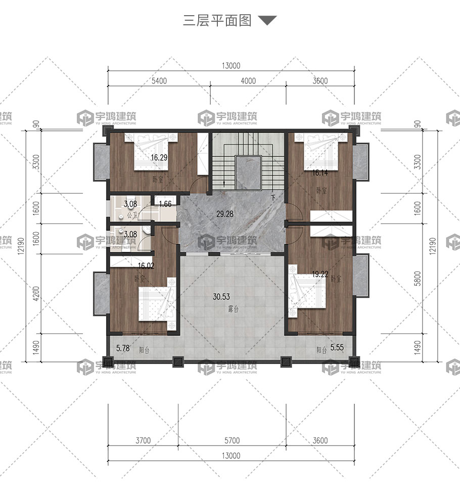 | 開間:13米 | 進深:12.19米 | 占地面積:163平方米 | 建筑面積:424.1平方米 |