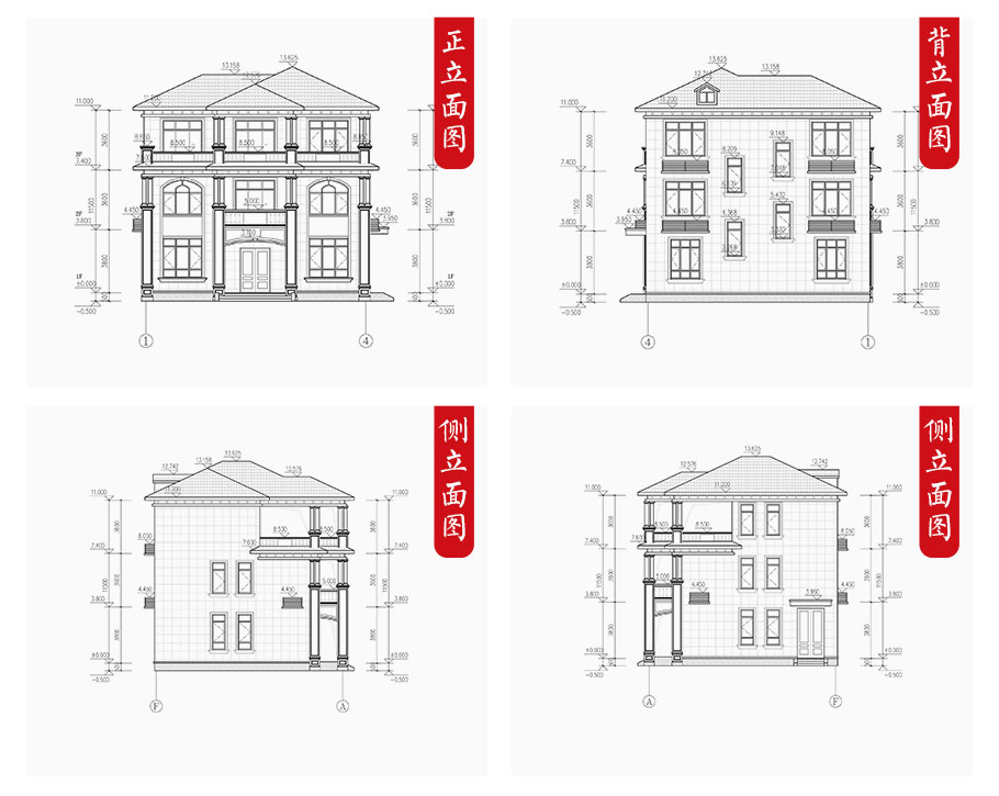 建筑立面圖:東立面圖,西立面圖,南立面圖,北立面圖,剖面圖;