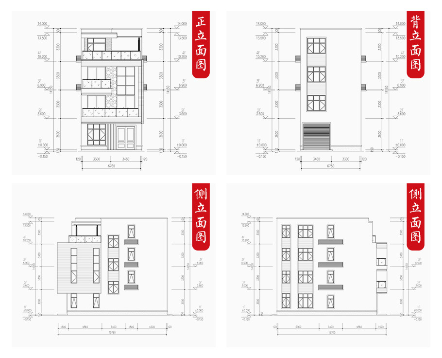 建筑平面圖:一層平面圖,二層平面圖,三層平面圖,四層平面圖; 建筑立面圖:東立面圖,西立面圖,南立面圖,北立面圖,剖面圖; 大樣圖:樓梯詳圖,細部大樣,門窗大樣 |