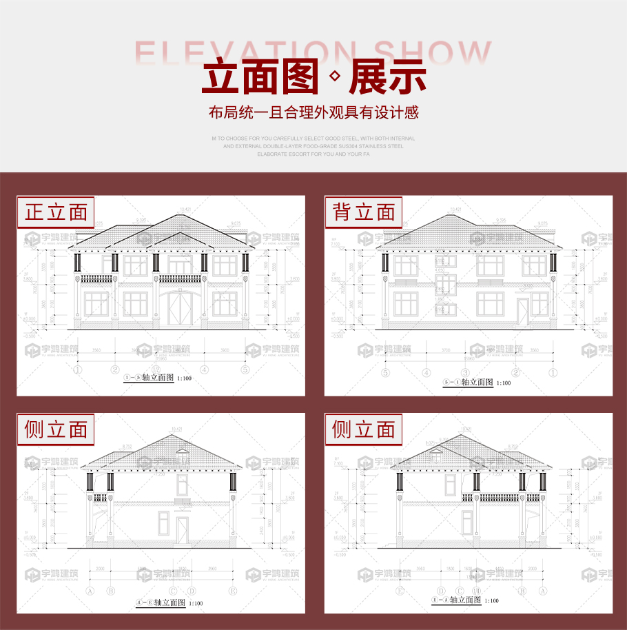 | 建筑圖: | 建筑平面圖:一層平面圖,二層平面圖; 建筑立面圖:東立面圖,西立面圖,南立面圖,北立面圖,剖面圖; 大樣圖:樓梯詳圖,細部大樣,門窗大樣 |