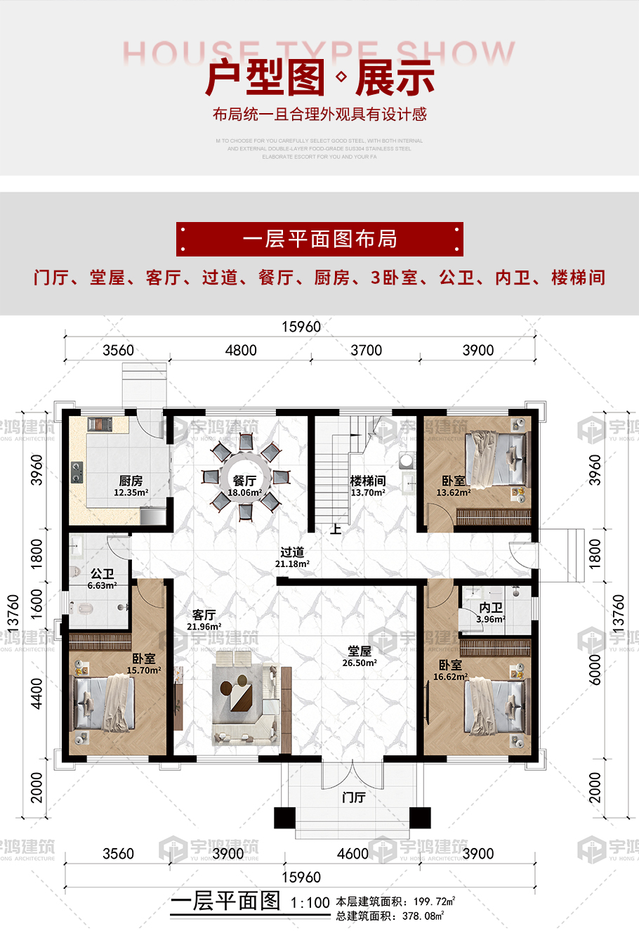 | 開間:15.96米 | 進深:13.76米 | 占地面積:205.59平方米 | 建筑面積:378.08平方米 |